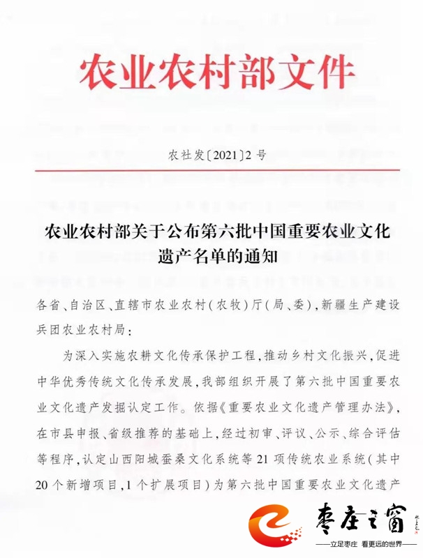 11月16日,農(nóng)業(yè)農(nóng)村部公布第六批中國重要農(nóng)業(yè)文化遺產(chǎn)名單,認定山西陽城蠶桑文化系統(tǒng)等21項傳統(tǒng)農(nóng)業(yè)系統(tǒng)為第六批中國重要農(nóng)業(yè)文化遺產(chǎn),其中嶧城石榴種植系統(tǒng)入選。
