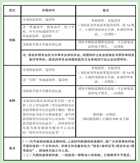 【查驗(yàn)證件】——【填寫國(guó)家開放大學(xué)報(bào)名登記表(也可提前自行下載打印電子版填好)】——【在“國(guó)家開放大學(xué)統(tǒng)一身份認(rèn)證平臺(tái)”錄入報(bào)名信息】——【打印報(bào)名信息表后本人核對(duì)簽字確認(rèn)】——【掃碼采集新生照片】——【在線繳費(fèi)(具體學(xué)費(fèi)以山東開放大學(xué)開放教育在線繳費(fèi)平臺(tái)為準(zhǔn),屆時(shí)如繳費(fèi)系統(tǒng)不開放,繳費(fèi)事宜則另行通知)】——【掃碼加入新生微信群】